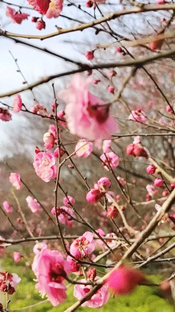 少部分梅花被最近的暖阳“骗”开,树枝上已经冒出米粒般的花苞,零星花朵绽放。