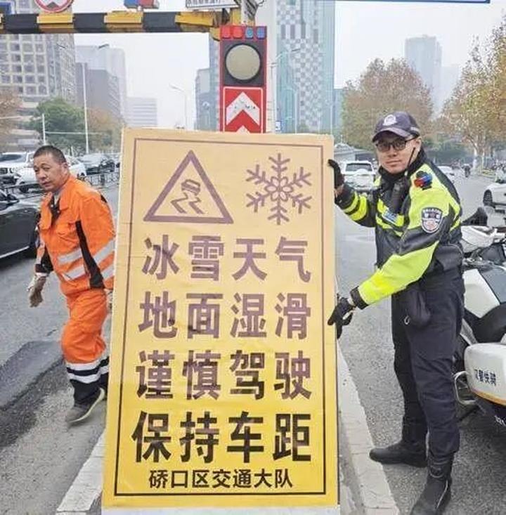 据了解,公安交管部门已部署充足警力,在全市范围内加强巡逻管控,特别是对跨江桥梁、环线高架、陡坡匝道等易结冰路段进行重点值守与动态监测。同时,武汉交警联合城管等部门,已提前储备融雪剂、防滑草垫等应急物资,除雪机械设备随时待命,将根据雪情冰情第一时间开展融雪除冰作业。