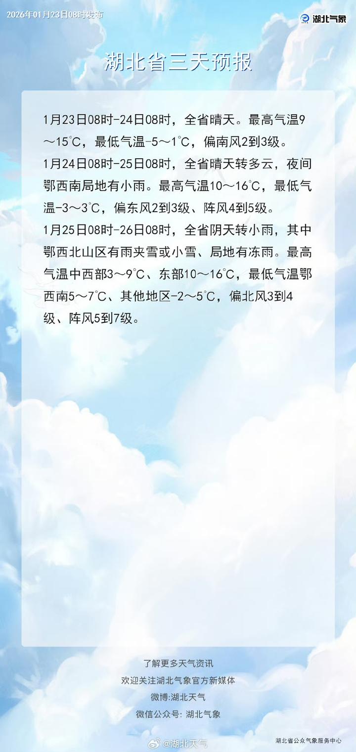 1月25日,全省阴天转小雨,其中鄂西北山区有雨夹雪或小雪、局地有冻雨,中西部地区最高气温将明显降至3~9℃,东部气温变化不大。此外,后天省内北风加大,阵风有5到7级。