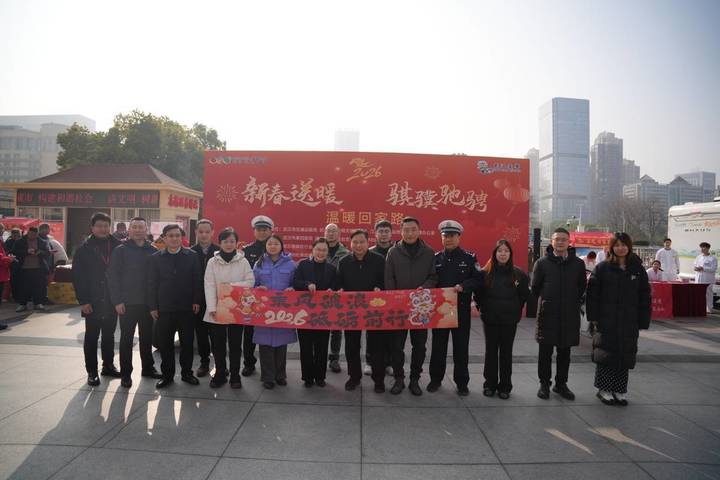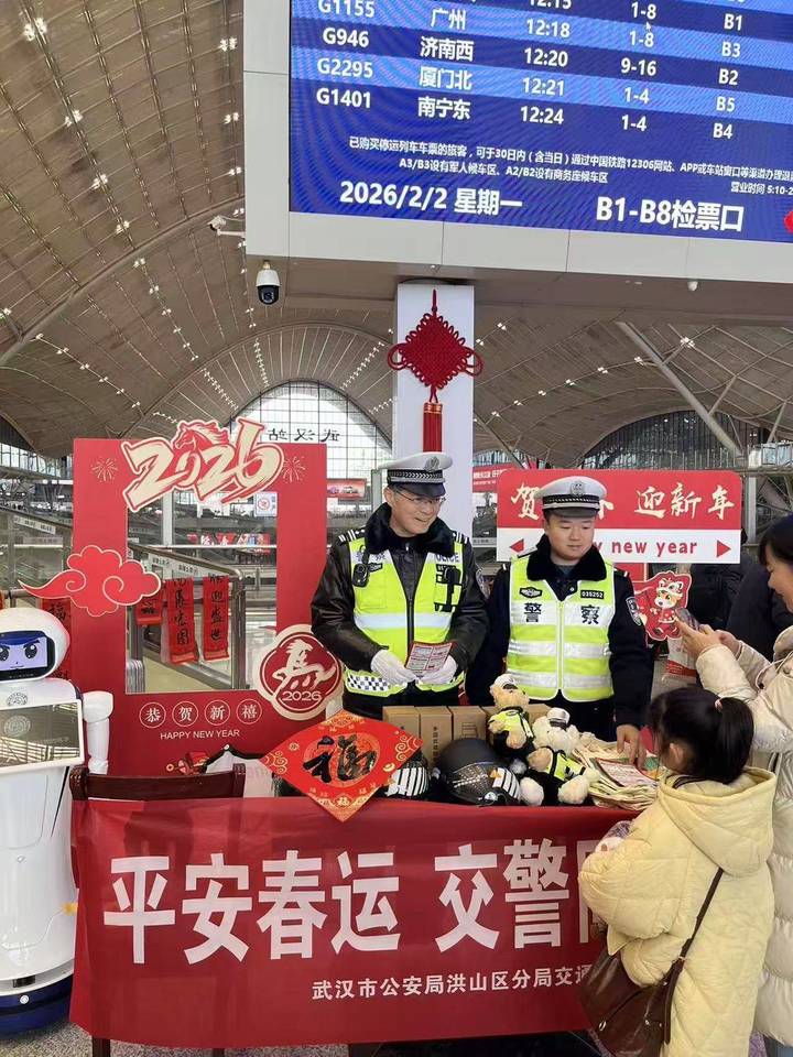 湖北日报讯(记者张竞恒、通讯员高航)2月2日,农历马年春运大幕正式拉开,为期40天的春运征程(2月2日至3月13日)就此开启。当天,“新春送暖 骐骥驰骋——2026温暖回家路”大型公益活动在汉口火车站广场举行,武汉交警携手相关单位,以实际行动为旅客送上新春祝福与安全守护。