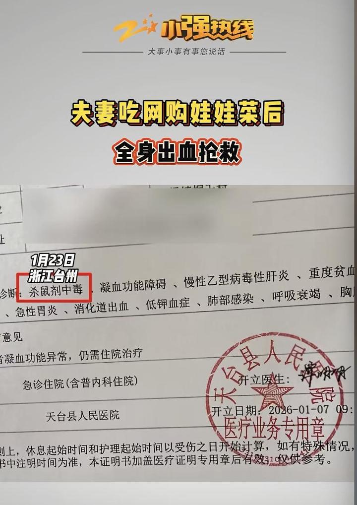 红星新闻此前报道,台州天台县杨女士和丈夫于2025年12月网购娃娃菜,食用后夫妇俩同时出现全身出血症状,入院抢救。医院诊断结果显示,夫妇俩均为老鼠药中毒,杨女士和丈夫血液中均检测出杀鼠剂成分。随后警方也在网购娃娃菜中检测出老鼠药,并受案。