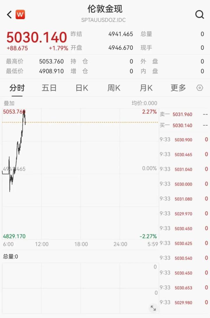 2月4日早盘,现货黄金开盘直线拉升,重新站上5000美元/盎司,最新报5030.14美元/盎司,涨近1.8%。