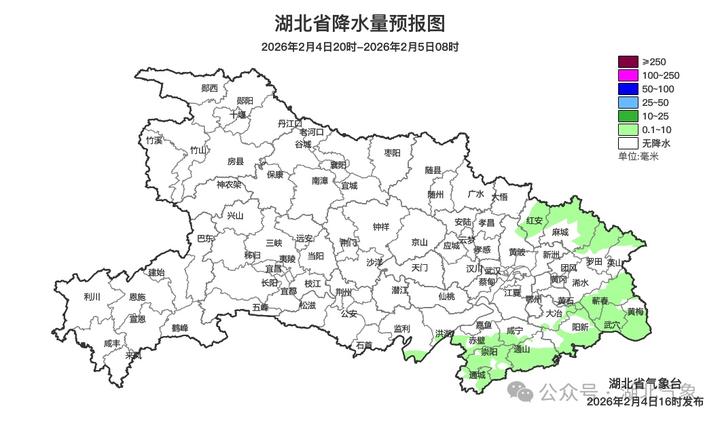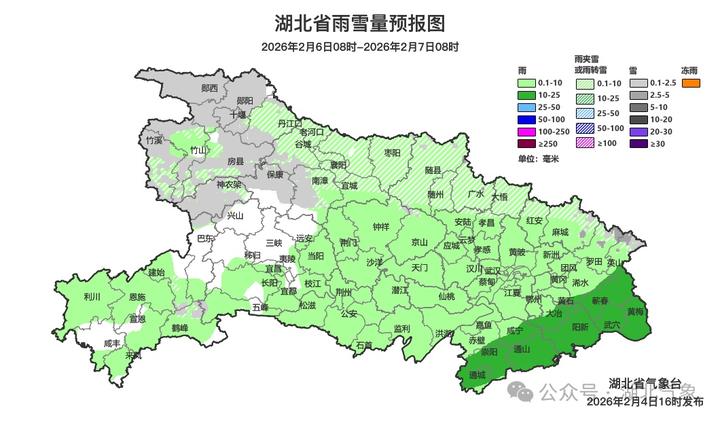 2月6日08时-7日08时,鄂西北、鄂西南北部、鄂东北北部阴天有小雨或雨夹雪,中高山区有小到中雪;其他地区阴天有小雨,鄂东南中雨。最高气温北部3~9℃、南部9~12℃,最低气温-1~5℃,偏北风4到5级、阵风6到8级。