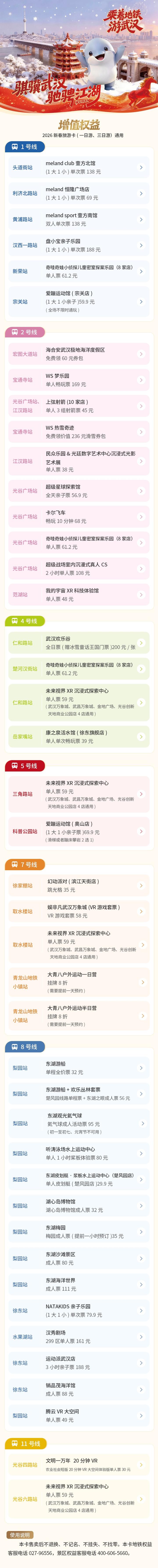 3.未购买到2026新春旅游卡的市民游客,也可进入“武汉文旅”小程序“乘着地铁游武汉”专题页面,获取沿线40余家合作优惠(每个商户均提供2026份优惠)。