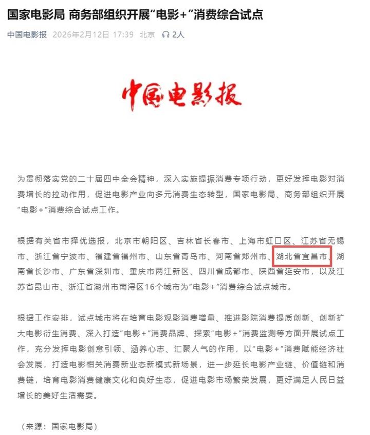记者获悉,国家电影局、商务部近日联合公布全国“电影+”消费综合试点城市名单,宜昌市成功入选,也是湖北省唯一获此国家级试点的城市。
