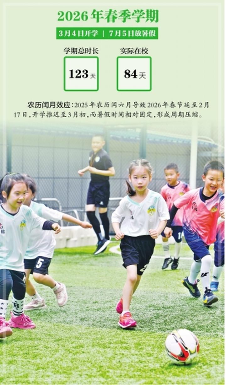 “超短学期”是特定农历年份下的特殊现象。今年春季学期变短,直接原因是2025年闰六月,2026年春节来得特别晚,导致春季开学晚,而暑假开始时间基本固定,从而压缩了本学期的教学时间。