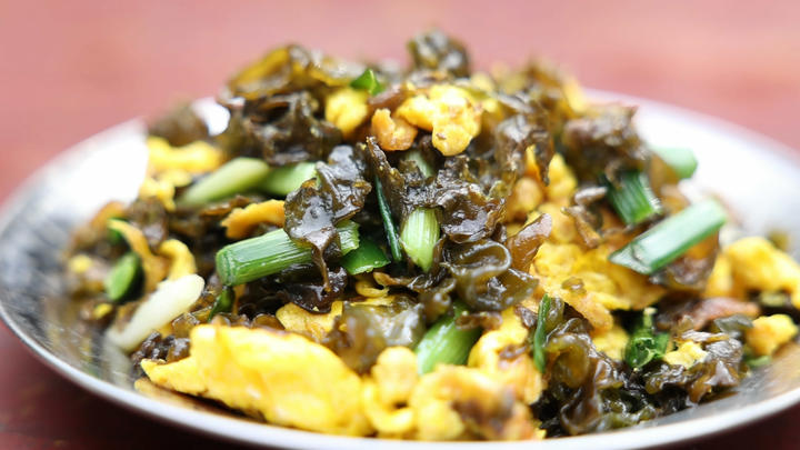 捡拾归来,清洗地皮菜是细致活,需要细心挑拣、反复淘洗,才能彻底清除草屑与泥沙。处理干净的地皮菜,搭配农家土鸡蛋简单快炒,是本地人最经典的吃法。热油翻炒间,鲜香扑鼻、金黄油润的地皮菜炒鸡蛋,成为家家户户餐桌上的春日美味。