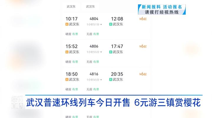 据悉,“武汉东至武汉东” 环线列车已于3月12日正式开售,有出行需求的旅客可通过12306官方平台购票。该列车暂定运行时间为3月14日至4月2日,后期是否继续开行,将根据实际客流情况确定。