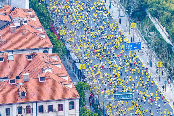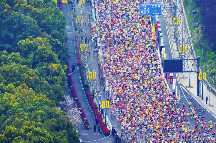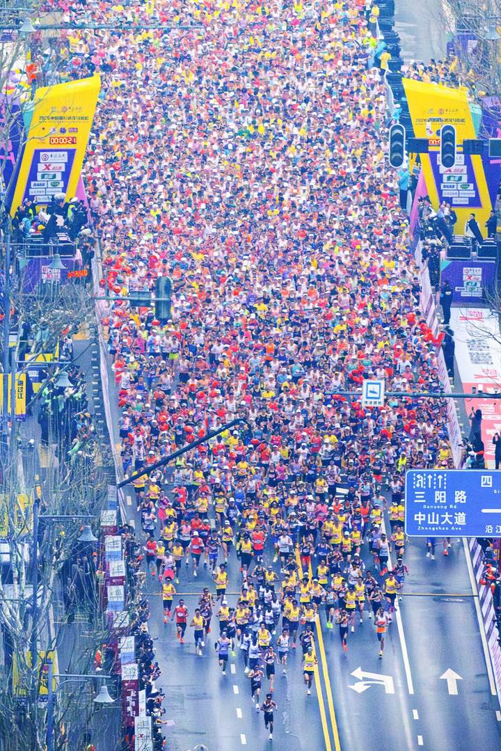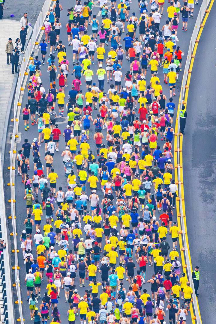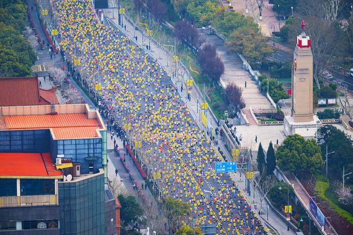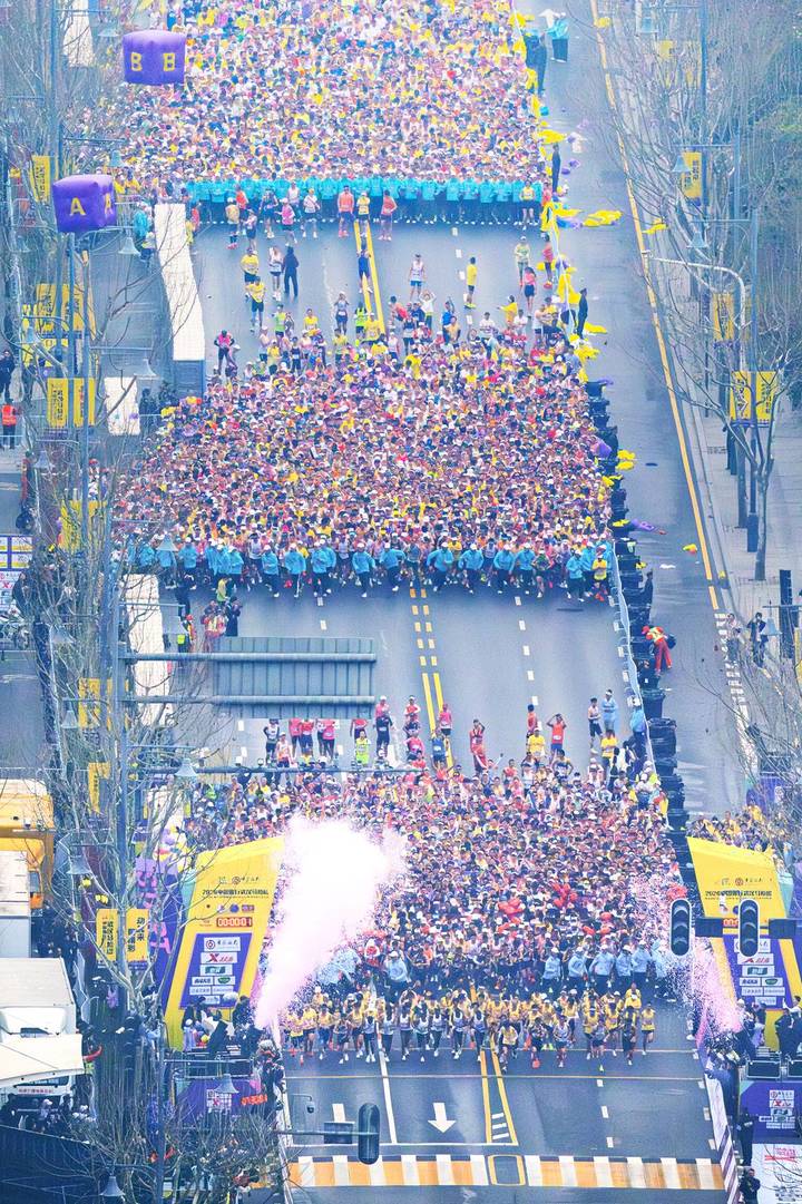 3月22日,在武汉沿江大道高楼俯瞰武汉马拉松,选手集结区一眼望不到头。当日上午7时30分,2026武汉马拉松正式鸣枪起跑,三万名选手从汉口沿江大道奔涌而出,开启穿越武汉三镇的征程。(湖北日报全媒记者 任勇 摄)