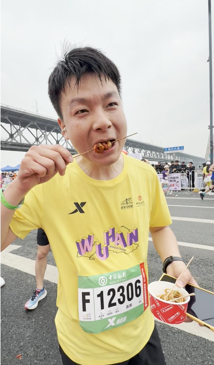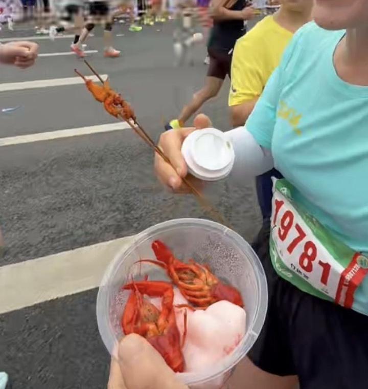 补给点有许多跑者停留,一位来自北京的跑者端起热干面边走边吃,一位来自福建的跑者还拿了一串小龙虾。