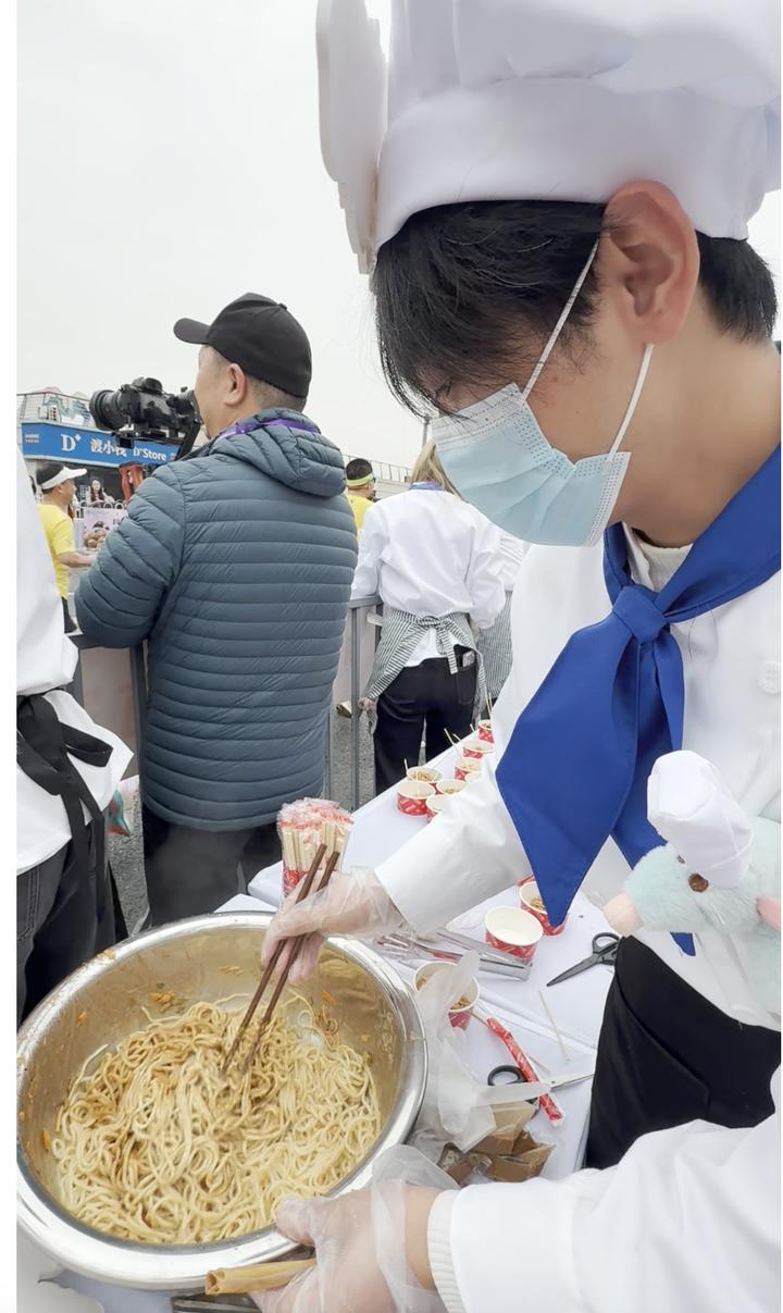 “我吃了热干面、樱花糕、小龙虾串,还喝了椰子水,现在准备吃牛排。”一位来自天津的跑者在等待牛排出锅,“武汉马拉松真的太豪横了,我来武汉就是为了吃一个全饱,希望明年可以再中签。”