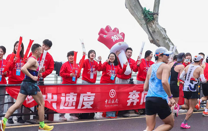 本届“汉马”赛道首次实现武汉七大中心城区全覆盖,从百年街巷到大江大湖,从历史地标到生态绿廊,一路繁花相伴,一路风光尽览。“最美赛道”记录下选手们的激情,也见证“中行红”的热情。中国银行的志愿者守候在沿途各个加油站点,手持加油棒、挥舞旗帜,用响亮的呐喊、真挚的笑容、暖心的鼓励,为每一位奋力奔跑的“好汉”助威加油。