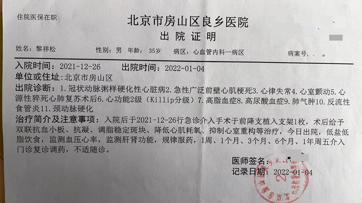 “二梨”的心脏被植入了1个支架,10天后身体无碍顺利出院。出院证明里写着:急性广泛前壁心肌梗死,心源性猝死心肺复苏术后等。出院次日,他便抛下在北京购置的冰箱、电视、电脑等家当,马不停蹄赶回湖北老家,“就像动物的某种本能,受伤后只想回家找庇护。”