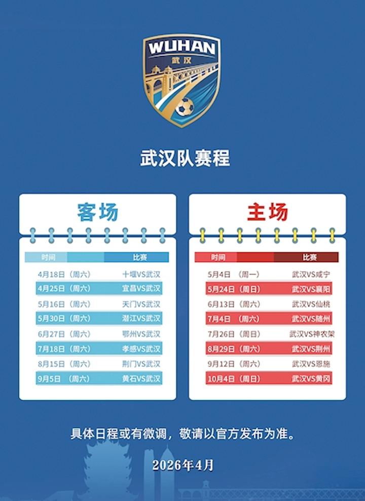 出征仪式上,著名足球评论员、前央视《足球之夜》制片人、金话筒奖得主刘建宏作为赛事信息发布人,全面揭晓武汉队赛程、阵容、主场、票务、球迷活动等核心信息。4月18日,武汉队将在十堰客场迎来首战。主场首战在5月4日,武汉队对阵咸宁队,后续依次对阵襄阳、仙桃、随州、神农架、荆州、恩施、黄冈等对手,10月4日常规赛收官战,吹响最后冲锋号角。