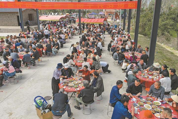 襄州区朱集镇下湾村第二届梨花文化艺术节开幕,游客在品尝千人宴。记者 王虎 张雪飞 摄