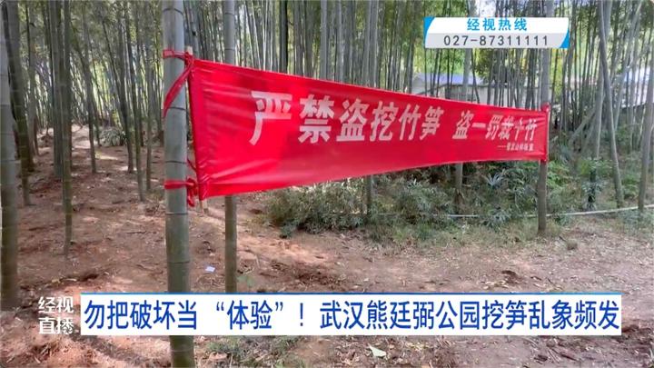 经视直播记者在江夏区熊廷弼公园看到,竹林地面上有很多挖竹笋留下的坑洞,现场还有十分醒目的条幅写着“禁止挖竹笋,挖一罚十竹”。