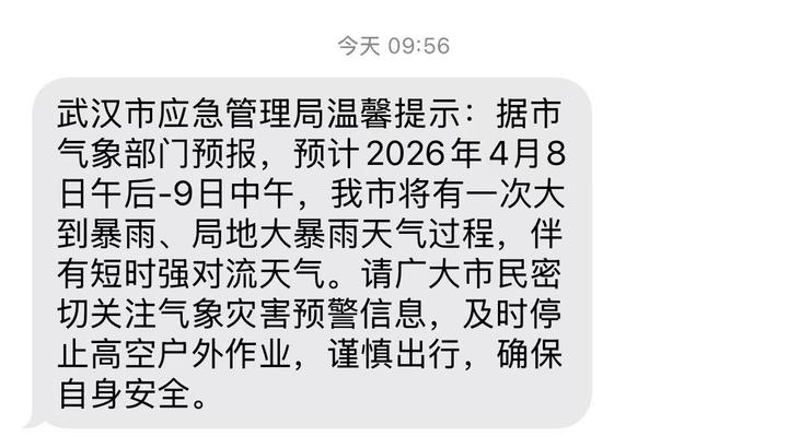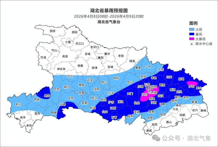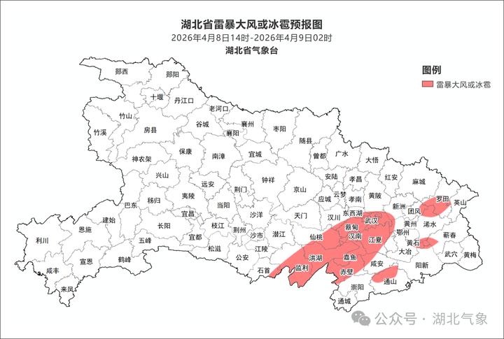 湖北省气象台2026年4月8日06时发布暴雨强对流消息:预计今天到明天上午,恩施、宜昌、荆州、荆门、随州东部、孝感、天门、仙桃、潜江、武汉、黄冈、 鄂州、咸宁阵雨转大雨到暴雨,其中孝感南部、仙桃北部、武汉西部、黄冈北部局地有大暴雨,上述地区有短时强降水(最大小时雨强 20~50 毫米,局地 60 毫米以上);荆州、仙桃、武汉、黄冈、黄石、鄂州、咸宁局地有雷暴大风(9~11 级,局地 12 级)或冰雹,请公众注意防范!