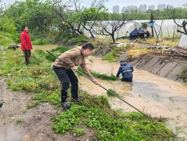 莲花湖社区工作人员彭靖在排查一千六片区菜地时,发现田间排水沟渠被大量杂草、淤泥和杂物堵塞,雨水无法顺利排出,不仅威胁菜农收成,还存在渍水倒灌的风险。他立即联系同事赶赴现场。大家不顾泥泞湿滑,有的手持长杆奋力疏通沟渠,有的直接跳入浑浊的积水中徒手清理堵塞物。泥水没过他们的胶鞋和裤腿,双手在杂物中用力扒扯,全力打通排水“堵点”,确保沟渠畅通,最大限度降低渍水对农田的影响。