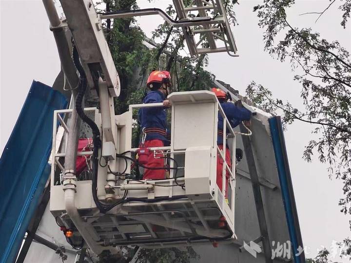 9时53分,东西湖区走马岭街一居民楼顶整块遮雨棚被大风刮落,悬挂在路边树干上,摇摇欲坠。接警后,走马岭消防救援站立刻出动1辆消防车、6名消防员赶赴现场处置。消防员在到达现场时,只见一块约4平方米的遮雨棚正悬挂在大树枝干上,距离地面约有12米高,周边场地较为空旷。现场指挥员立即制定处置方案,消防员升起登高云梯车靠近遮雨棚,使用安全绳对其进行安全固定,待固定完毕后,地面人员协同发力,沿安全绳将遮雨棚平稳下放至地面。最终,悬空的遮雨棚被安全转移,高空隐患彻底消除。