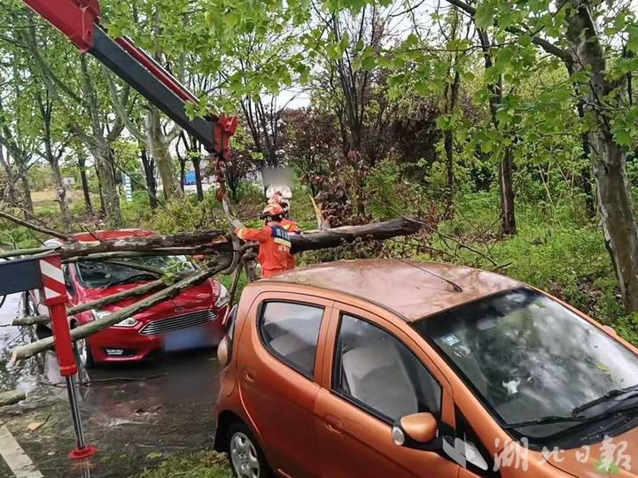 9时08分,江夏区五里界梁子湖大道附近,路边一棵直径约40厘米的大树被拦腰折断,砸中停靠在路边的一辆轿车。接警后,五里界消防救援站立刻出动1辆消防车、5名消防员赶赴现场处置。消防员抵达现场后发现,折断的树干横亘在马路中央,部分枝干压在一辆轿车车头位置,经排查车内无人员被困。消防员使用机动链锯对断树枝干进行切割分解,随后利用抢险救援车吊臂将压在轿车车头上方的树干安全牵移。经过40分钟处置,现场清理完毕,道路恢复通行。