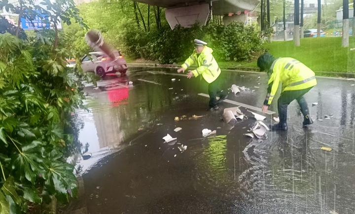 当日早高峰8时许,交管大队一中队民警郭建波巡逻至红庙立交高架桥下时,发现路面当中散落着高架脱落的排水管碎块,有几块儿大的横在路面当中,容易引发事故。郭建波冒雨下车,徒手将碎块清理至路边,快速消除隐患,确保道路畅通。