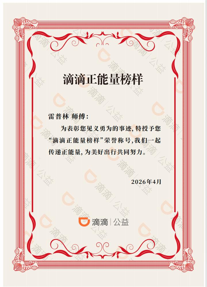 此次救援全程有电子摄像头和雷普林车辆的行车记录仪完整记录,为事故处理和救援过程提供了清晰佐证。为表彰雷普林见义勇为的正能量行为,滴滴公益正式授予其“滴滴正能量榜样”称号,并通过“滴滴正能量在路上公益专项计划”给予1000元现金奖励,鼓励其在出行路上传递善意。