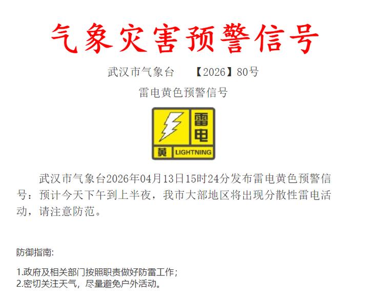 武汉市气象台发布雷电黄色预警信号