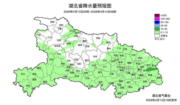 4月13日20时-14日08时,鄂西北阴天,局地有零星小雨;其他地区阴天有小雨。夜间到早晨省内局地有雾(雨雾)。最低气温13~16℃,偏北风3级、阵风4到5级。