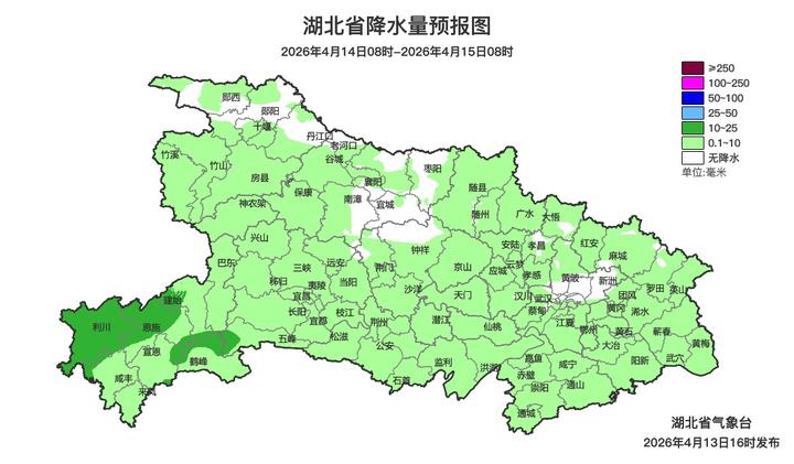 4月14日08时-15日08时,鄂西南阴天有小雨,局地中雨;其他地区小雨转阴天。最高气温17~21℃,最低气温12~16℃,偏北风2到3级、阵风4到5级。