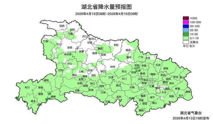4月15日08时-16日08时,鄂西南、江汉平原南部、鄂东北东部、鄂东南阴天有短时小雨;其他地区多云到阴天,局地有短时小雨。最高气温21~25℃,最低气温13~17℃,偏东风转偏北风2到3级。