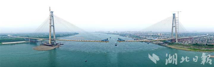 4月13日,枝江长江大桥建设现场弧光闪烁、机声隆隆,火热的施工节奏响彻江面。大桥南北两岸主塔双臂相向延伸,正朝着江心 “握手” 冲刺;俯瞰桥面,一道狭长天光横贯江面,一艘轮船从即将闭合的桥跨缝隙间悠然穿行,构成一幅壮阔的时代建设图景。