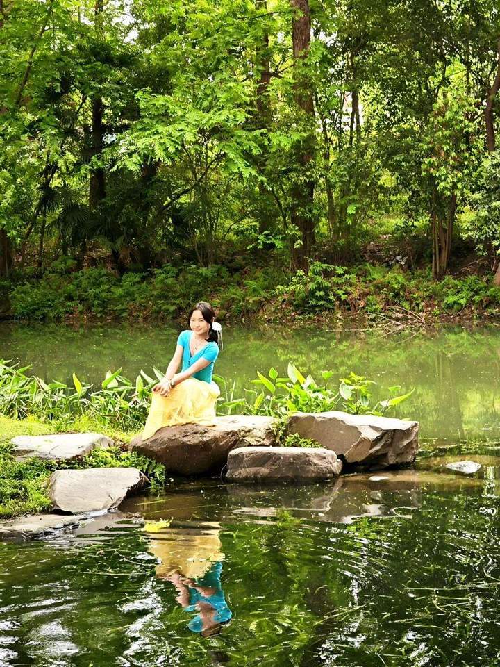 微风拂过,水面漾开圈圈涟漪,也轻轻撩动她的裙摆。四周是浓得化不开的绿,空气里满是草木的清新。