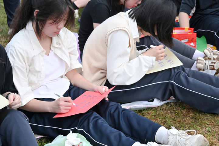 野餐期间穿插了“心愿时光机”互动环节。学生提前写好祝福纸条并放入瓶中,随机抽取朗读。“愿你提笔从容,落笔生花”“不管结果如何,你都是我最好的同桌”——这些来自同窗的祝福在现场引发阵阵掌声。各班还安排了学生担任临时摄影师,用手机记录野餐中的互动瞬间。