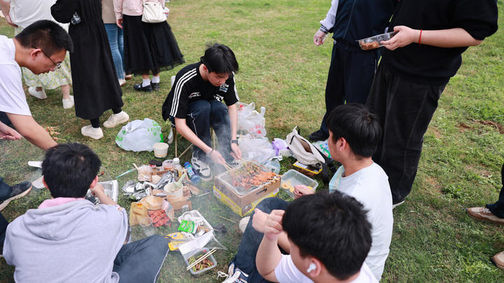 野餐环节,各班在草坪上铺开自带的野餐垫,以小组为单位用餐。与以往统一配餐不同,这次野餐由各班自行组织。有的班级架起便携烤炉,学生轮流烤制自带的腌制肉串和海鲜;有的班级用卡式炉煮起火锅,牛肉丸、蔬菜在汤中翻滚;还有学生带来了自制蛋糕和家乡特产,互相分享品尝。各班班主任和科任教师全程参与,与学生一起动手备餐、围坐交流。
