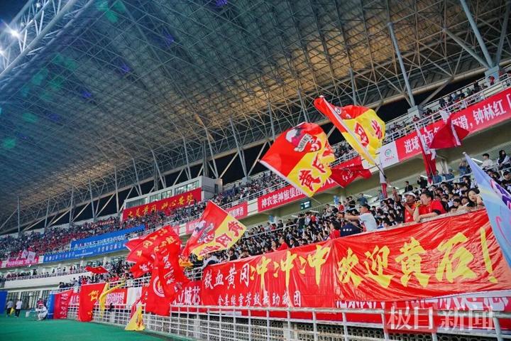 18日19时许,可以容纳2万人的黄冈市体育中心座无虚席,现场万人同唱《八月桂花遍地开》,引爆全场热度。黄冈市艺术学校组织了130余人的拉拉队,成为看台上最亮丽的风景线。