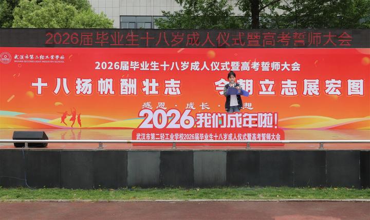 4月20日下午,武汉市第二轻工业学校校园内旗帜飘扬、掌声雷动,2026届毕业生成人仪式暨高考誓师大会如期举行。500余名中职学子在师长与家长的见证下,告别懵懂少年时,以成年人的担当接过高考冲刺的接力棒,在职业教育蓬勃发展的东风中,向着本科梦想全力奔跑。