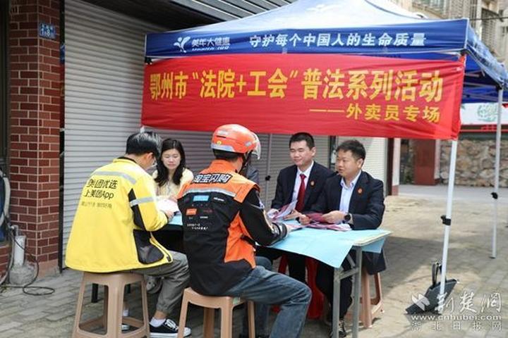 活动现场,鄂州市“法院+工会”普法系列活动外卖员专场同步开展,邀请专业法律工作者围绕劳动权益保障、工伤保险、交通安全等外卖配送员关心的问题进行现场讲解和答疑,发放普法宣传资料,引导新就业形态劳动者依法维护自身合法权益。