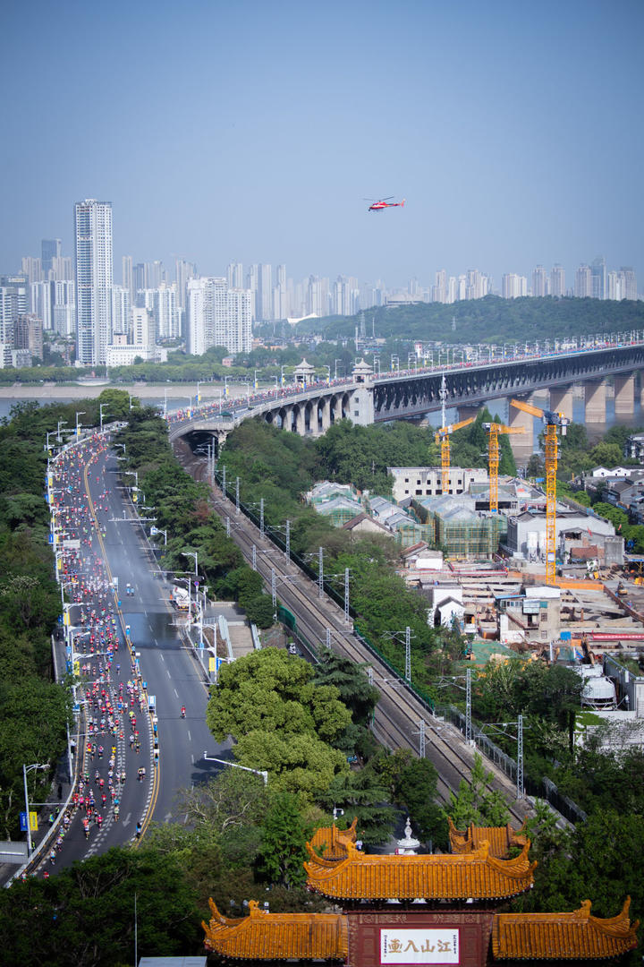 2023年4月16日,武汉马拉松参赛选手经过长江大桥。新华社记者 伍志尊 摄