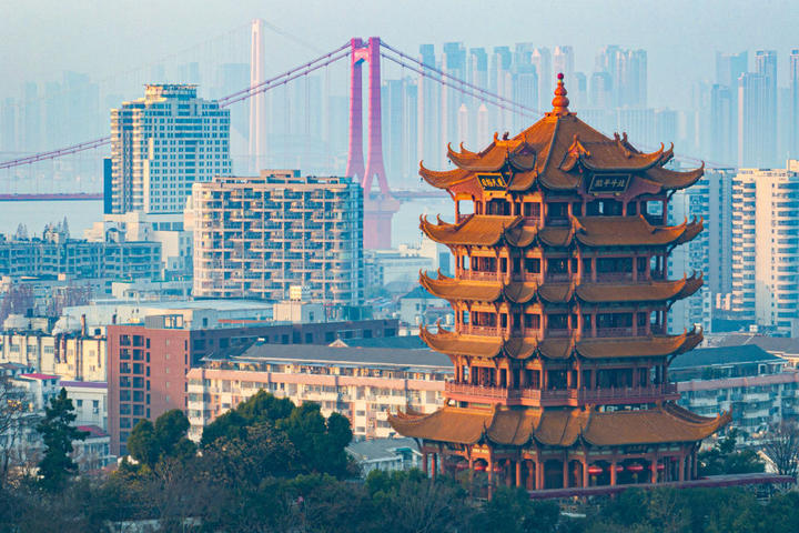 2025年12月26日拍摄的武汉黄鹤楼,后方依次是鹦鹉洲长江大桥、杨泗港长江大桥。新华社记者 肖艺九 摄