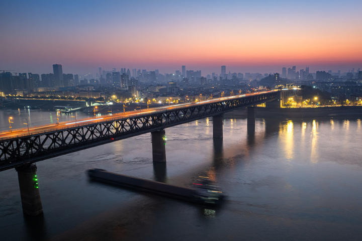2025年12月26日,晨曦中的武汉长江大桥。新华社记者 肖艺九 摄