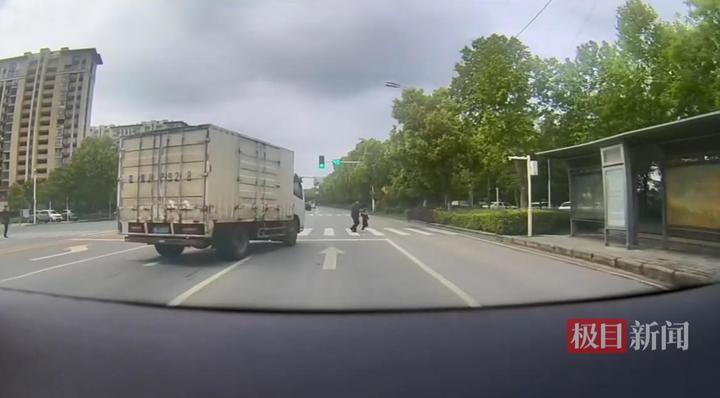 此前,4月23日,湖北省武汉市黄陂区一处路口,红灯即将转绿,一名女子拉着孩子正匆匆穿过斑马线。此时,一辆车牌为鄂WJP928的厢式货车没有急于起步,而是突然向右打了一把方向,主动“压线”拦住了后方来车。这一挡,让女子和孩子安全通过;这一挡,也提醒了后车——盲区里还有行人。