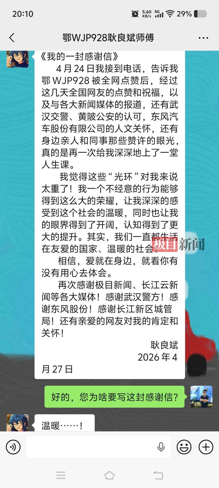 “我想给为我点赞以及关心我的群体单位和网友,写一封感谢信可以吗?”4月27日傍晚,极目新闻记者手机微信上弹出这样一条信息,一股暖意顿时涌上心头。写下感谢信的不是别人,正是这两天被央媒和全国网友点赞的车牌号为“鄂WJP928”的武汉司机耿良斌。