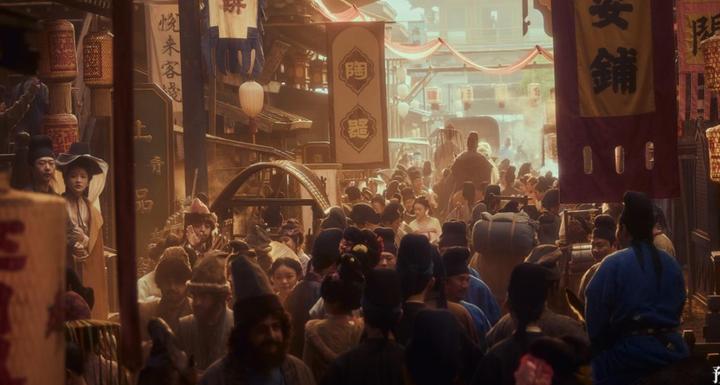 大鹏说,想拍出“一种古装的现实主义的质感”。比如李善德上班的路上,就呈现一种“早高峰”的拥挤状态;岭南的场景则更像一个唐朝的国际化港口,从演员的服饰、镜头中出现的商品种类等方方面面都更注重异域风情。