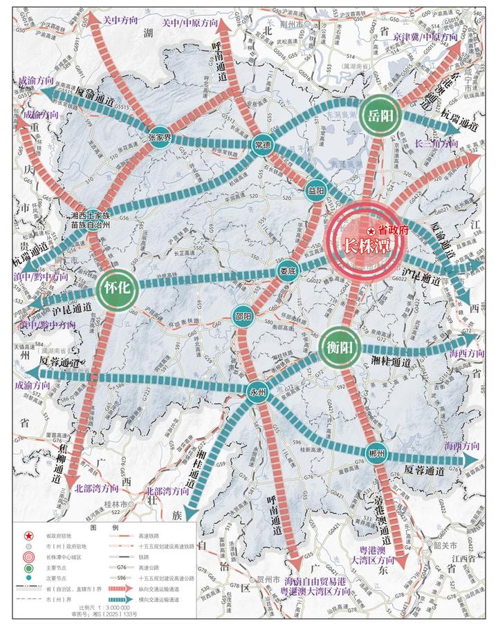 “十五五”期间,湖南将深度融入国家综合立体交通网主骨架布局,进一步提升骨干通道内畅外联能力,重点贯通呼南、厦渝通道,扩容京港澳、沪昆通道,提升焦柳、湘桂通道,完善杭瑞、厦蓉通道,形成“三纵五横”综合交通运输大通道,全面提升向粤港澳、长三角、京津冀、成渝地区双城经济圈和关中、黔中、北部湾、海西区域等经济空间的通达能力。