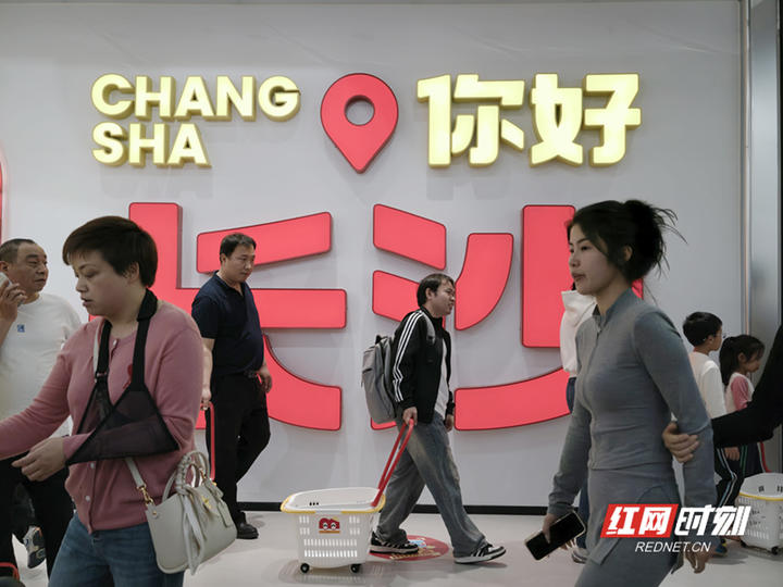 “你好长沙”标识墙前,人流与城市符号交织成景。