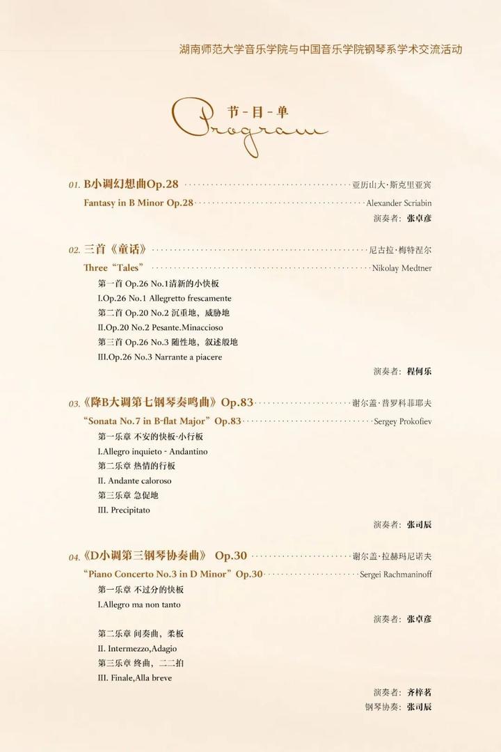 当天19:30,“张维教授钢琴教学音乐会”将在湖南师范大学和乐楼四楼音乐厅举行,来自中国音乐学院附中、本科及研究生阶段的优秀学生代表——张卓彦、齐梓茗、程何乐、张司辰将联袂献艺,集中展示钢琴教学的成果与独特理念。