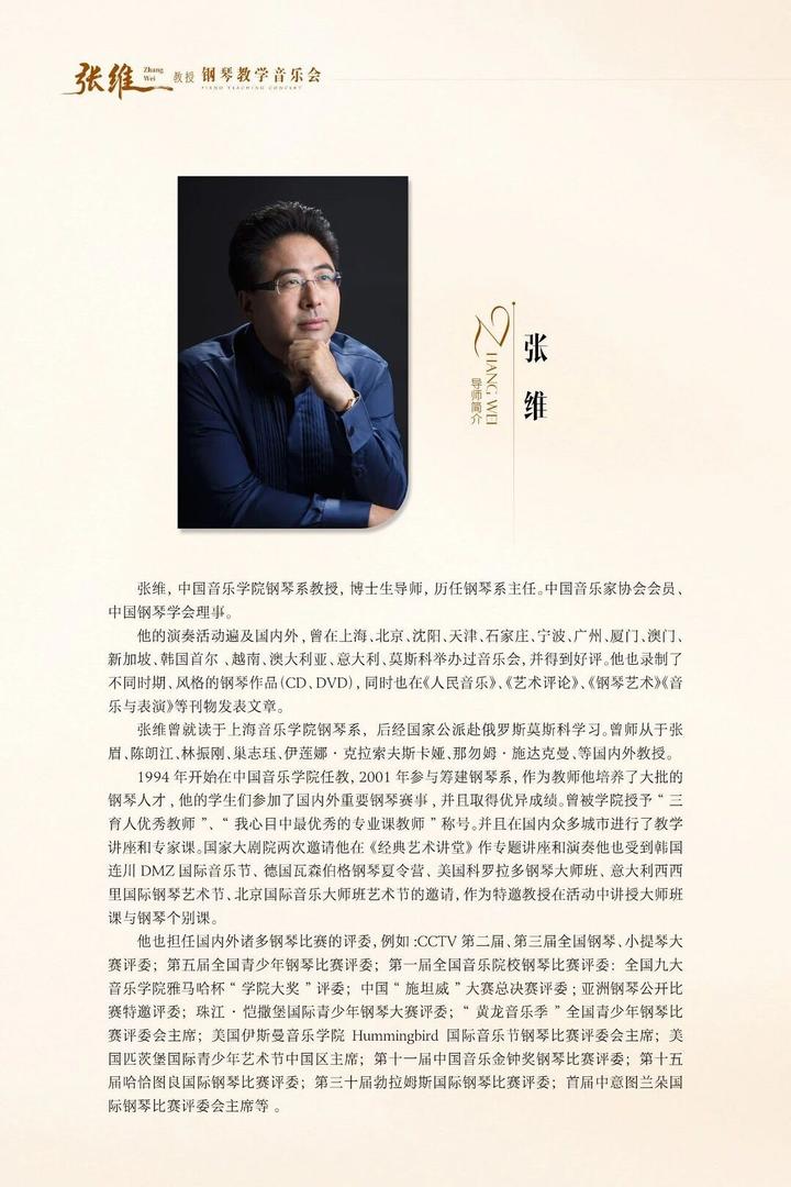 张维,中国音乐学院钢琴系教授、博士生导师,历任钢琴系主任,系中国音乐家协会会员、中国钢琴学会理事,师从张眉、陈朗江、那勿姆·施达克曼等教授,多次担任国内外重要钢琴赛事评委,深耕钢琴教育与演奏领域多年,是国内极具影响力的钢琴教育家。曾在上海、北京、韩国首尔、莫斯科等地举办音乐会,受邀在国家大剧院《经典艺术讲堂》作专题讲座和演奏,于韩国连川 DMZ国际音乐节、德国瓦森伯格钢琴夏令营、美国科罗拉多钢琴大师班、意大利西西里国际钢琴艺术节等活动中作为特邀教授讲授大师班课与钢琴个别课。