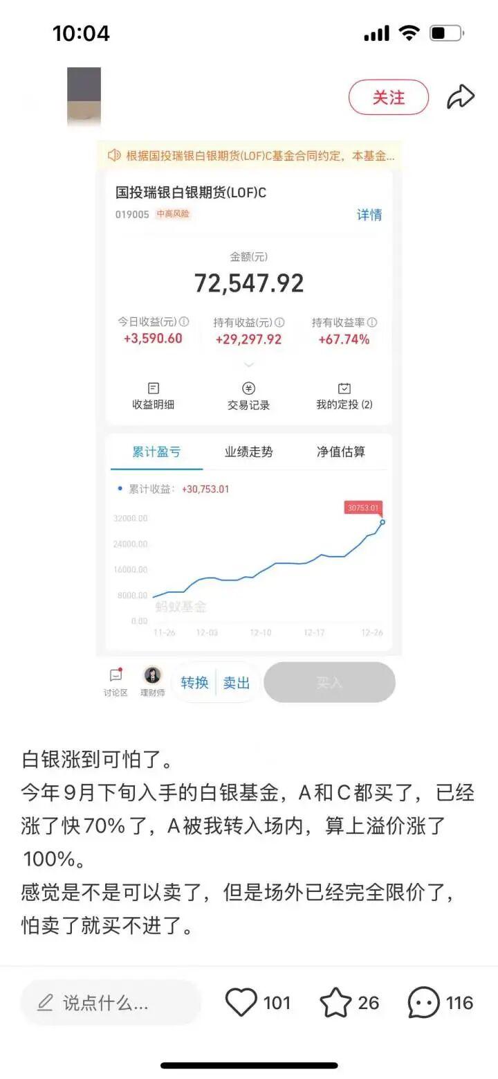 “涨到可怕!是不是可以卖了?”一位9月下午才入手白银基金的网友说,两只期货基金A和C整体涨了近70%。其中A被转入场内后。算上溢价涨了100%。