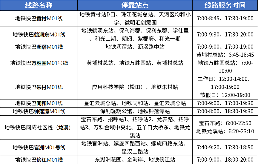 “地铁快巴”首批10条示范线重点覆盖鹤洞东、沥滘、黄村、万胜围、朱村、同和、钟落潭、龙溪、官洲、傍江等地铁站,接驳周边产业园区、学校及大型社区。具体线路信息如下: