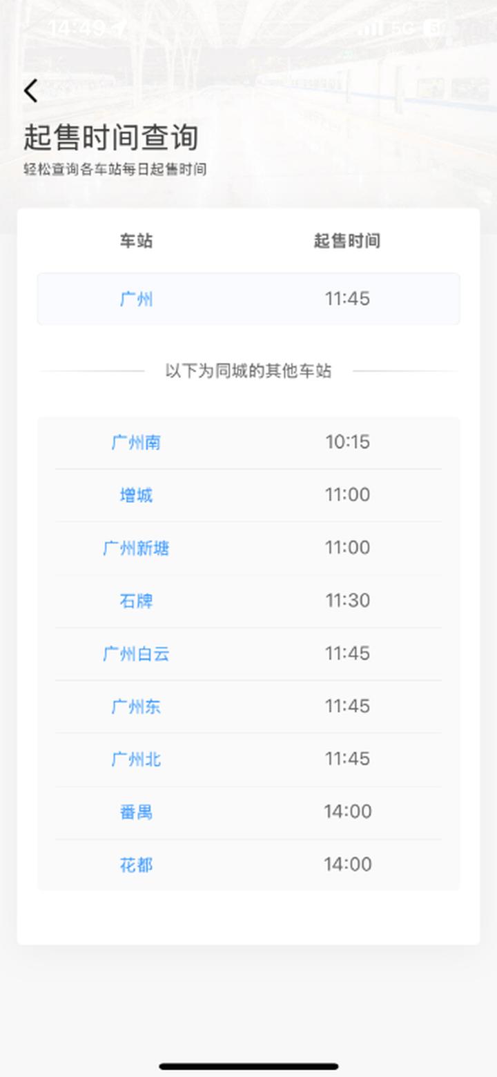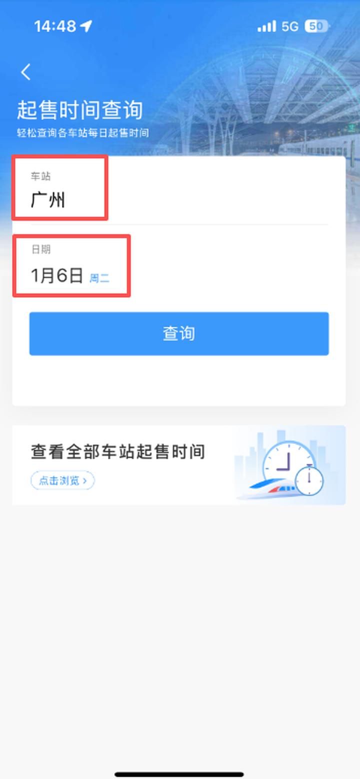 选择想要查询的车站及车票日期,点击查询,即可查看火车站的起售时间。